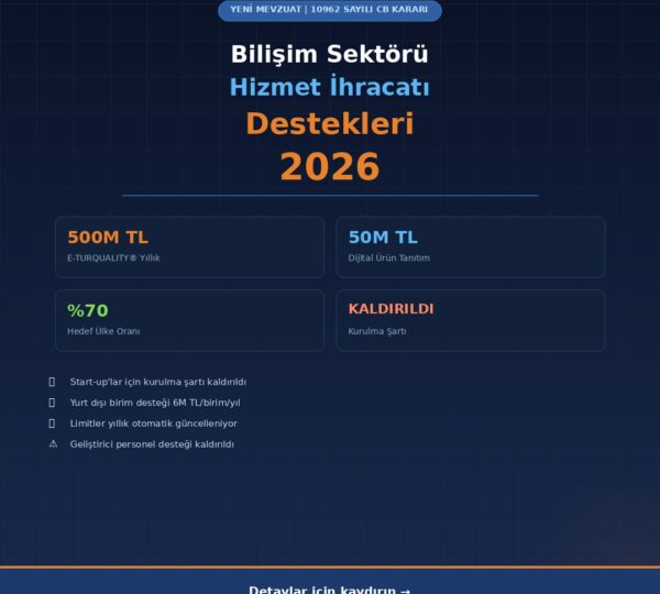 27 Şubat 2026 tarihli ve 10962 sayılı Cumhurbaşkanı Kararı ile Türkiye’nin bilişim, oyun ve yazılım sektörlerine yönelik hizmet ihracatı desteklerinde köklü bir dönüşüm gerçekleştirildi. 1 Ocak 2026’dan itibaren geçerli olan yeni sistem, eski 5447 ve 5448 sayılı kararları yürürlükten kaldırarak tüm destekleri Hizmet Sektörleri Atılım Programı ve Markalaşma Programı (E-TURQUALITY® dahil) çatısı altında birleştirdi.